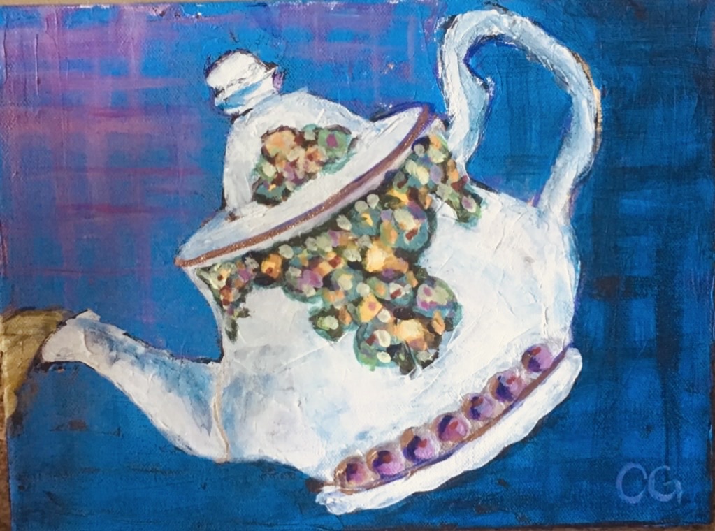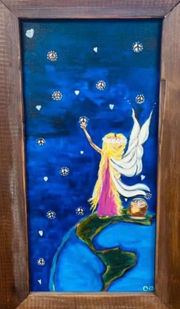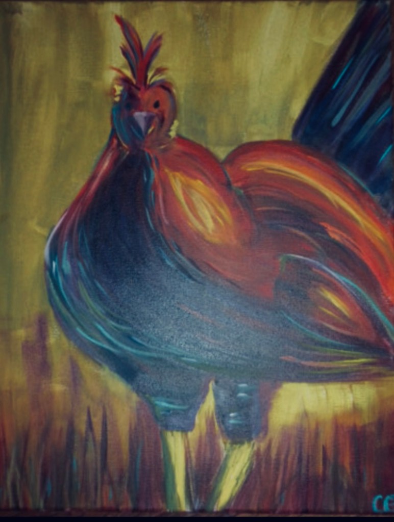 This piece captures the quiet authority and vibrant presence of a rooster standing fully in himself. Painted in sweeping, expressive strokes, the rooster’s form is alive with motion and layered color — deep blues grounding him, while fiery reds, oranges, and golds rise like embers through his feathers. 20 x 24 $450